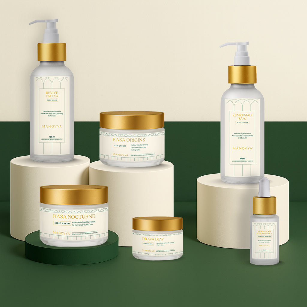 Drawn from Deccan wellness courts, Kumkumadi, aloe, and ashwagandha hydrate and soften, leaving skin luminous, supple, and calm.